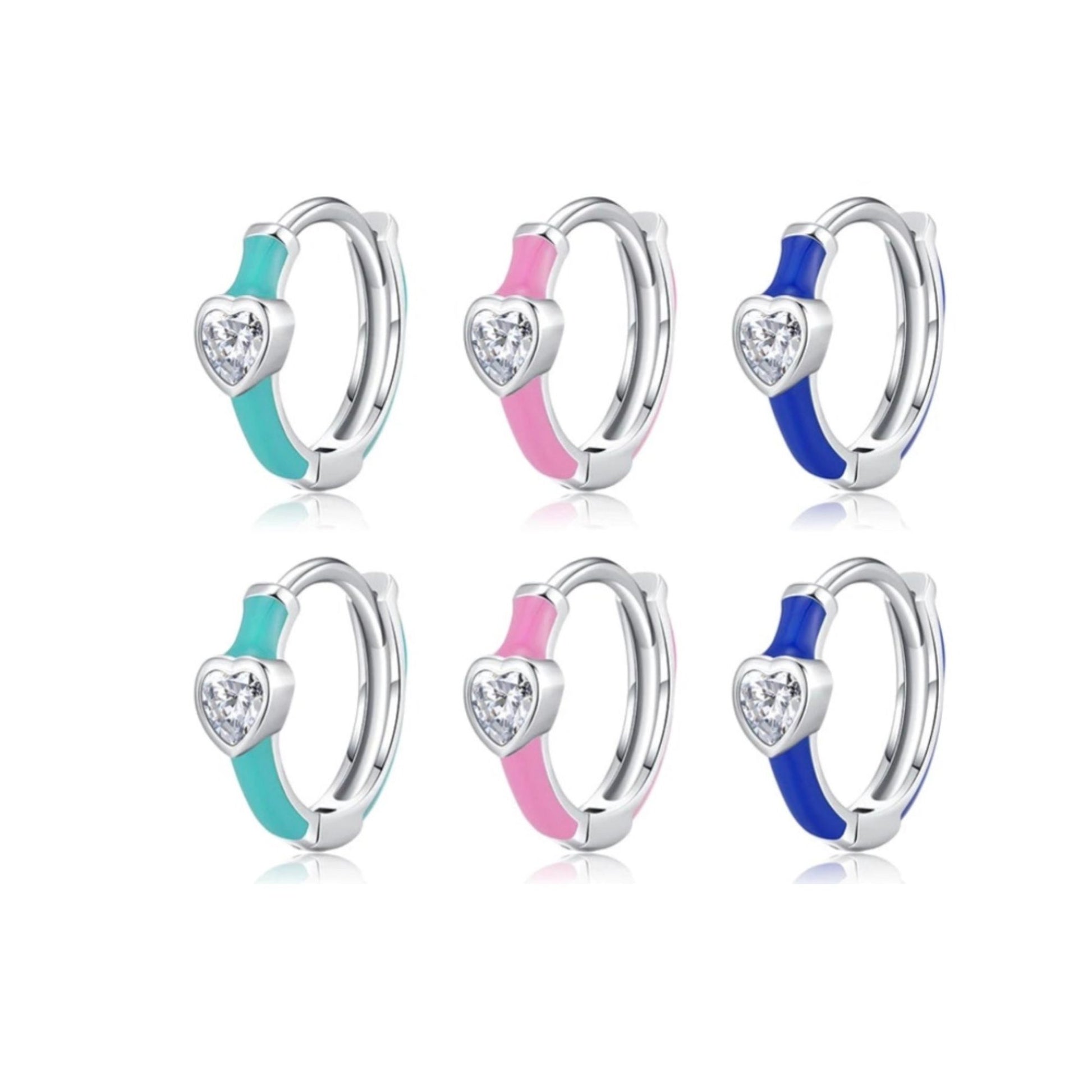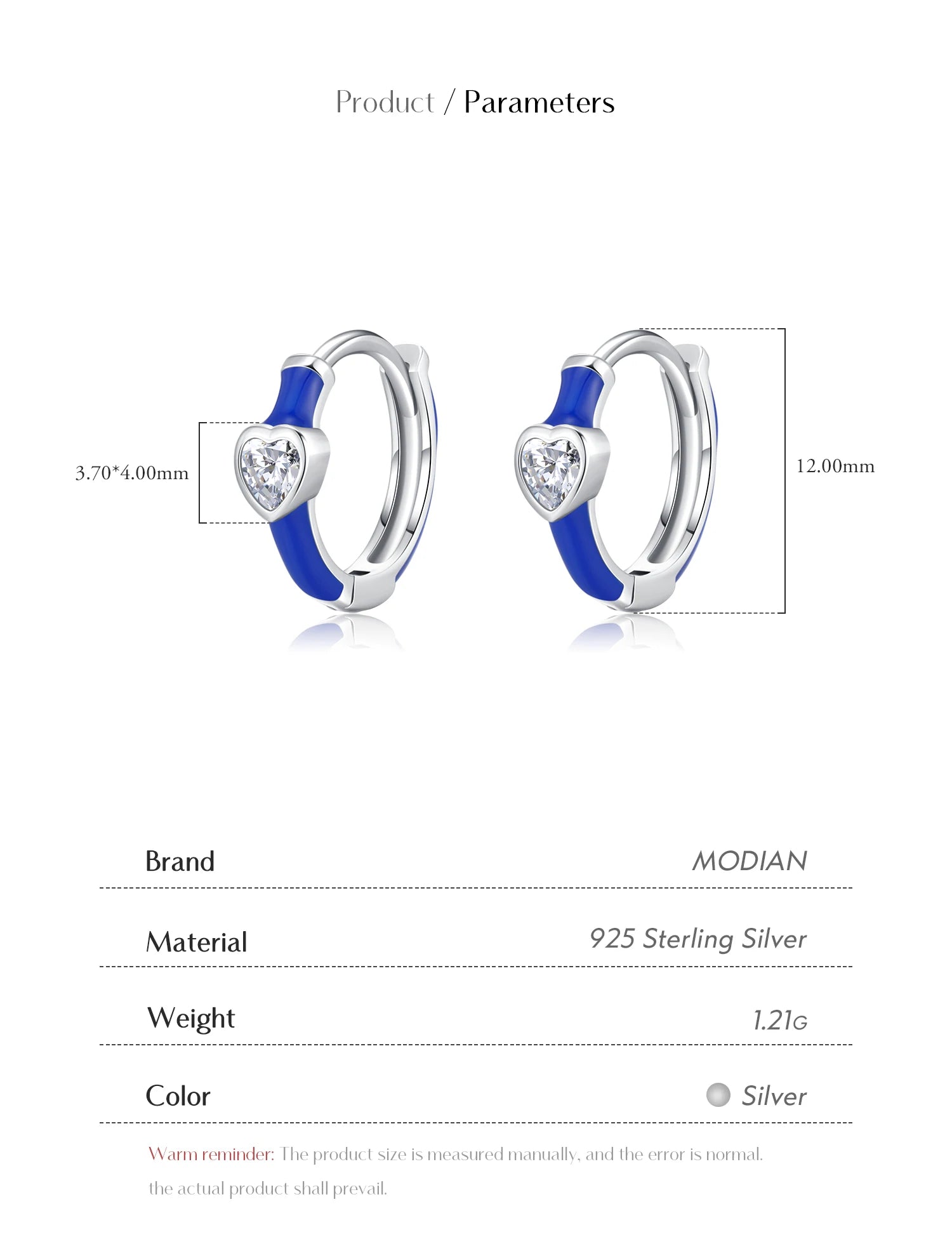 Romantic hoop earrings with a heart motif , embellished with small blue enamel and sparkling clear cubic zirconia stones . The playful yet elegant design combines modern urban vibes with a delicate, loving aesthetic. Crafted from high-quality 925 sterling silver , they are lightweight and comfortable to wear – ideal for weddings, dates, or as a sweet everyday statement.