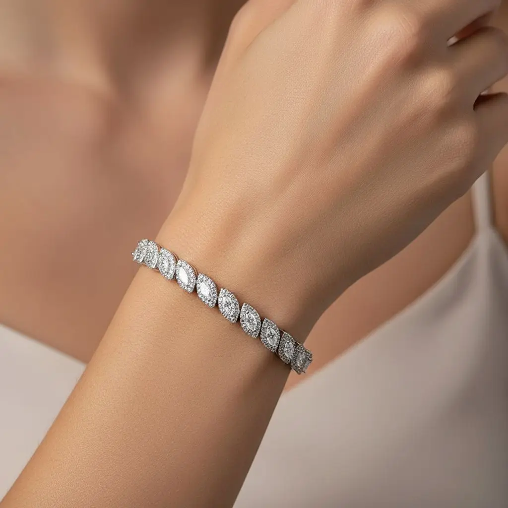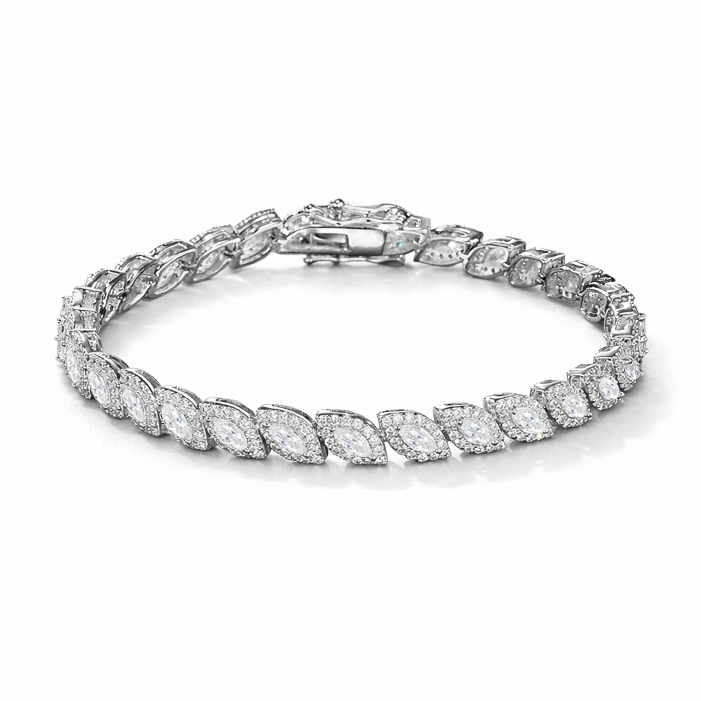 Elegantes Damen-Tennisarmband im modernen Marquise-Design, verziert mit funkelnden, marquisegeschliffenen Moissanit-Steinen in gleichmäßiger Kettenglieder-Anordnung. Das schlanke und zugleich luxuriöse Design verleiht dem Armband zeitlose Eleganz und macht es zur idealen Wahl für besondere Anlässe wie Jubiläen, Partys oder als stilvolles Brautaccessoire. Gefertigt aus 925 Sterling Silber, angenehm zu tragen, zertifiziert durch Drittanbieter und frei von bedenklichen Chemikalien.