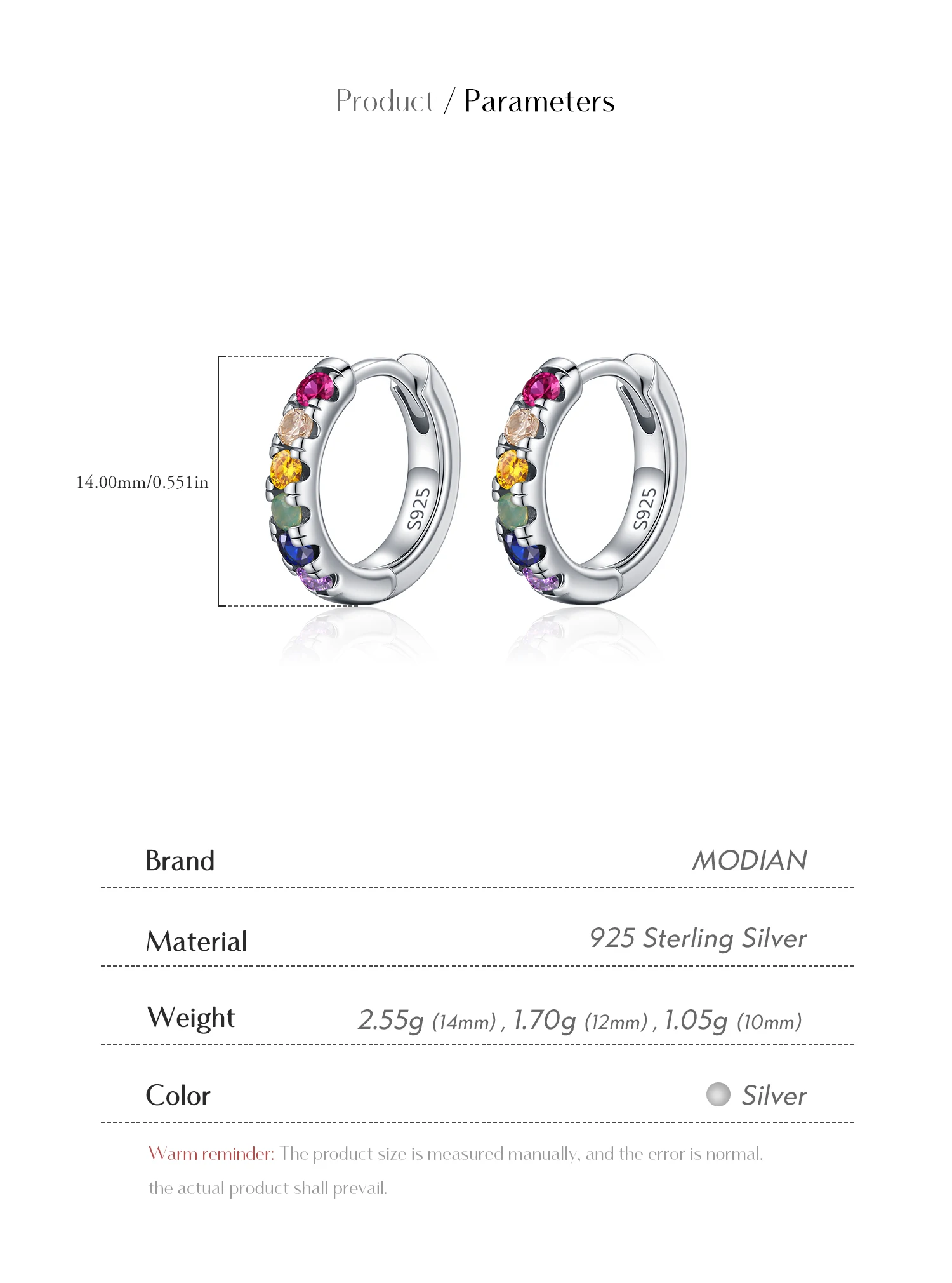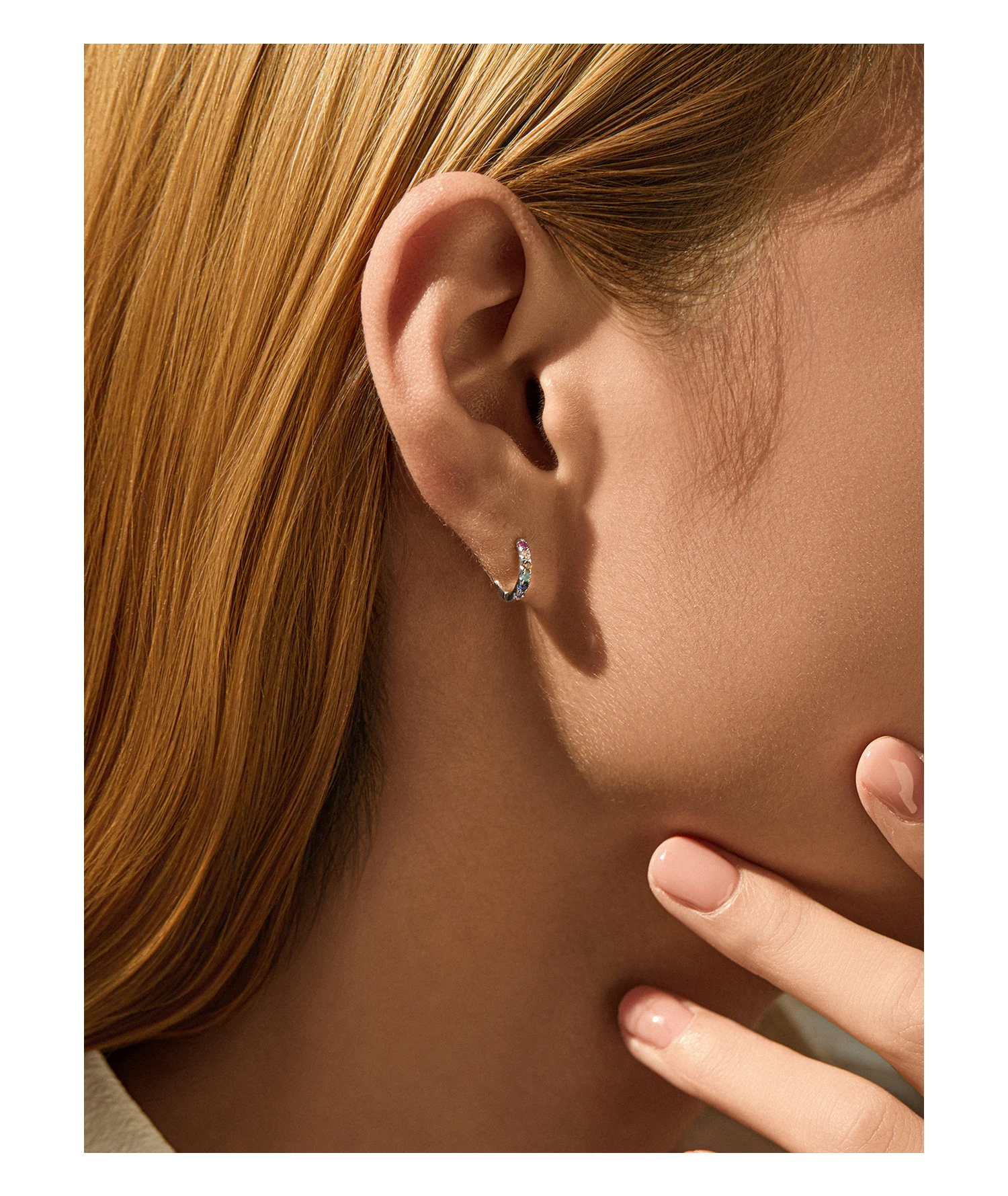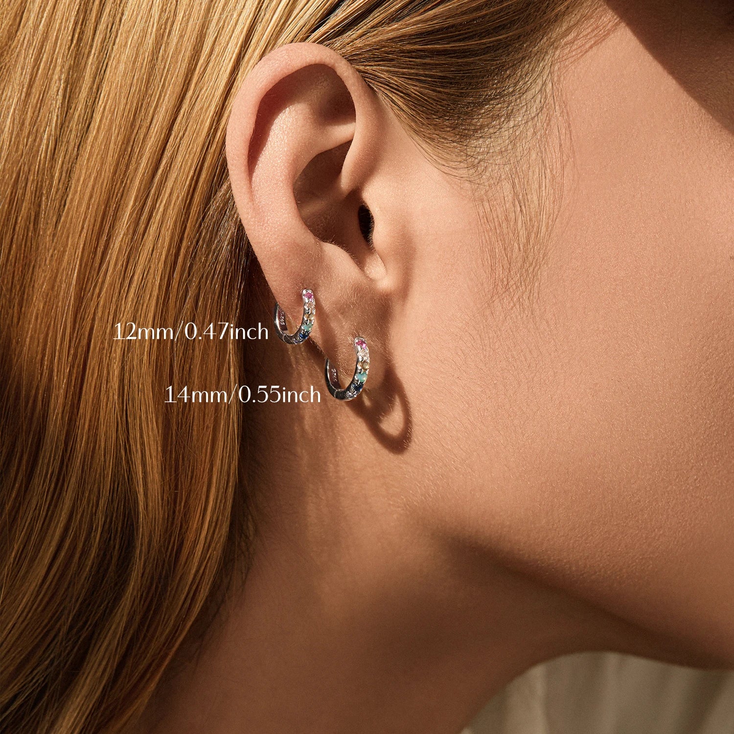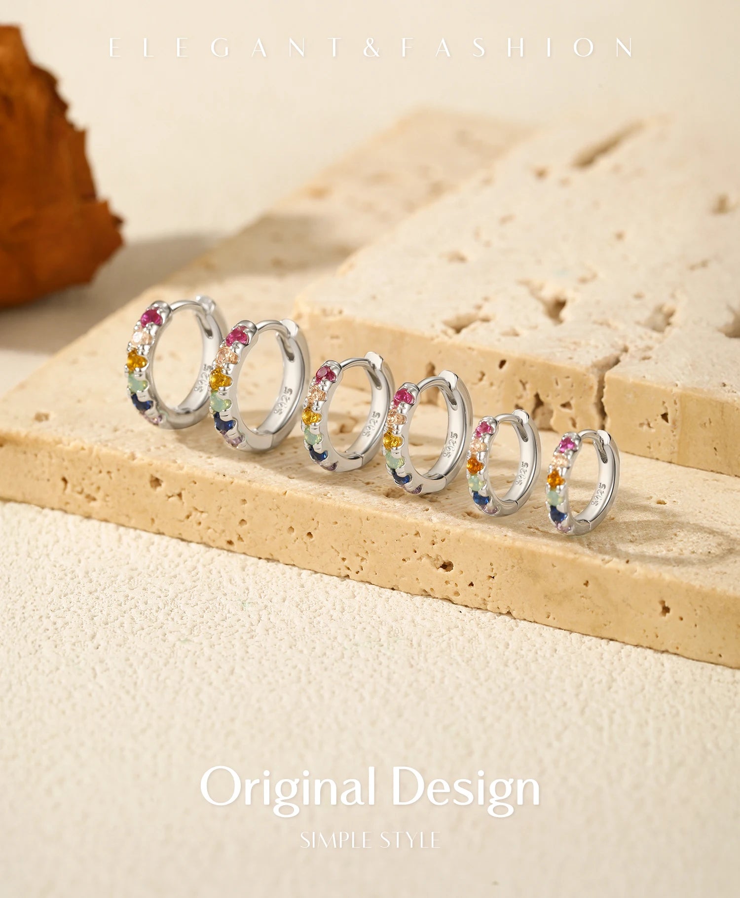 Modische Hoop Earrings in drei Größen, verziert mit funkelnden, rundgeschliffenen Zirkonia-Steinen in lebendigen Farben. Das stapelbare Design erlaubt vielseitige Looks von dezent bis auffällig und passt perfekt zu Alltag, Party oder besonderen Anlässen. Gefertigt aus 925 Sterling Silber, leicht und angenehm zu tragen, mit hochwertiger Verarbeitung.