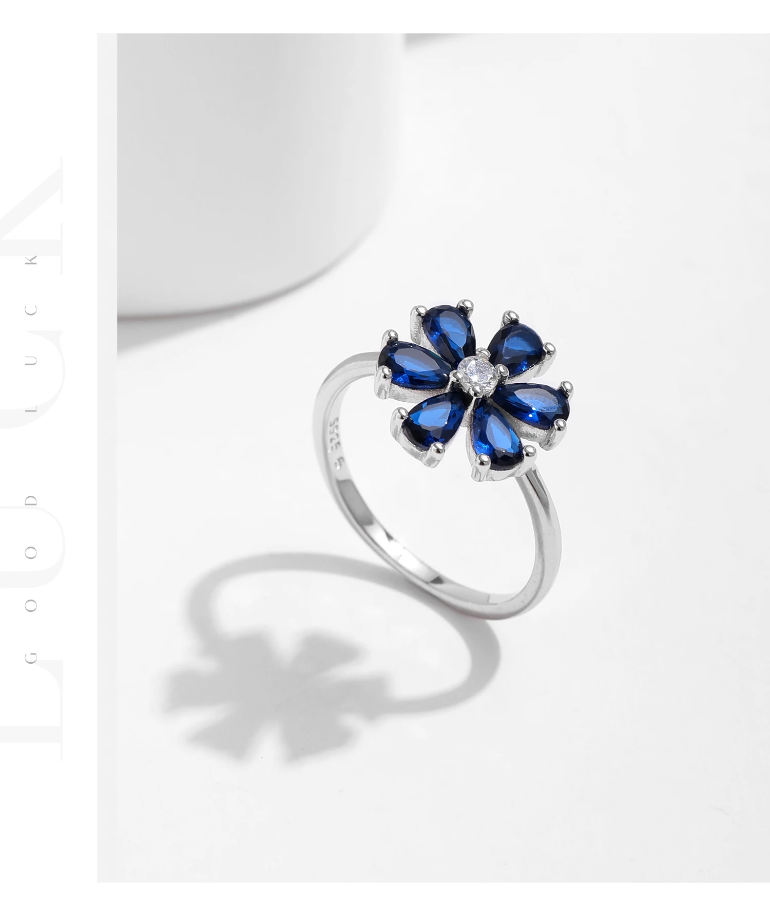 Der intensiv blaue Water-Drop-Stein steht im Mittelpunkt dieses Designs und wird von funkelnden Zirkonia-Akzenten umrahmt, die wie Blütenblätter im Licht erstrahlen. Gefertigt aus echtem 925 Sterling Silber, verkörpert dieses Schmuckstück pure Anmut und luxuriöse Raffinesse.