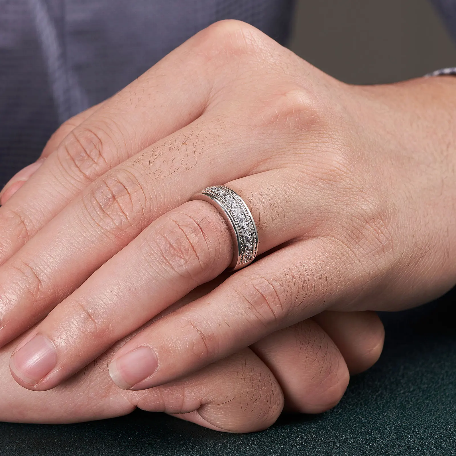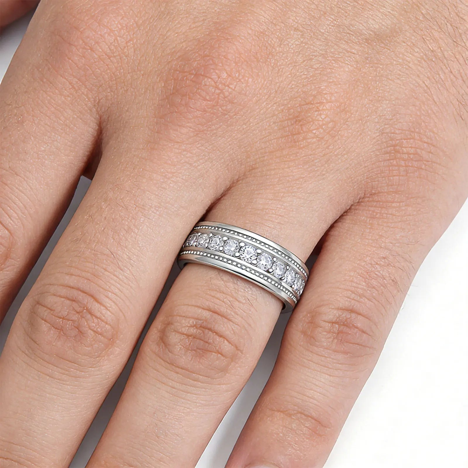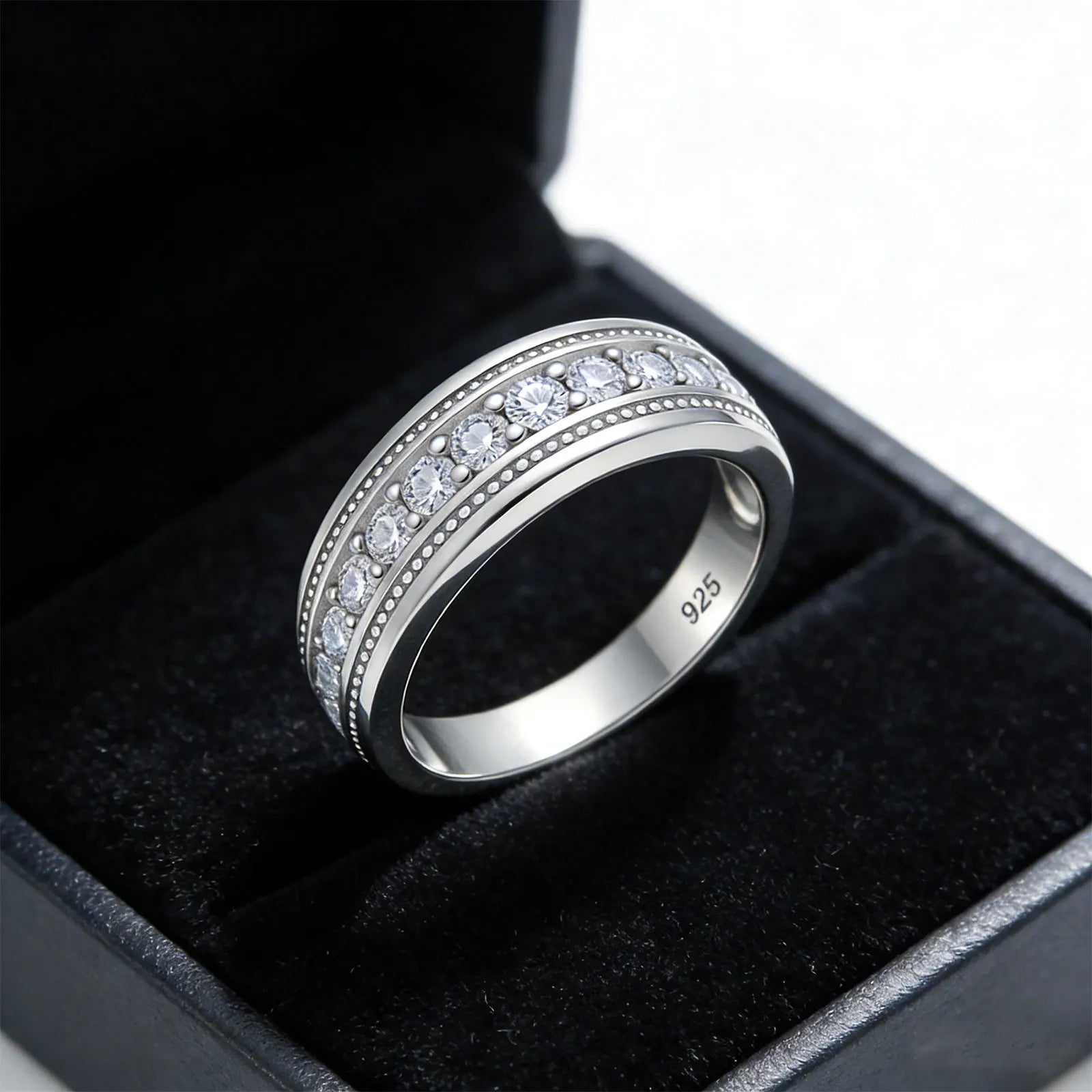 Eleganter Unisex-Ring mit funkelnden Moissanit-Steinen in klassischer Rundfassung, halb um den Ring angeordnet. Das luxuriöse, zeitlose Design macht den Ring zur perfekten Wahl für Hochzeiten, Verlobungen, Jubiläen oder als stilvolles Geschenk. Gefertigt aus 925 Sterling Silber mit Weißgold-Finish, leicht und angenehm zu tragen, zertifiziert (GRA, Nr. 66240414086) und wasserfest sowie farbbeständig.