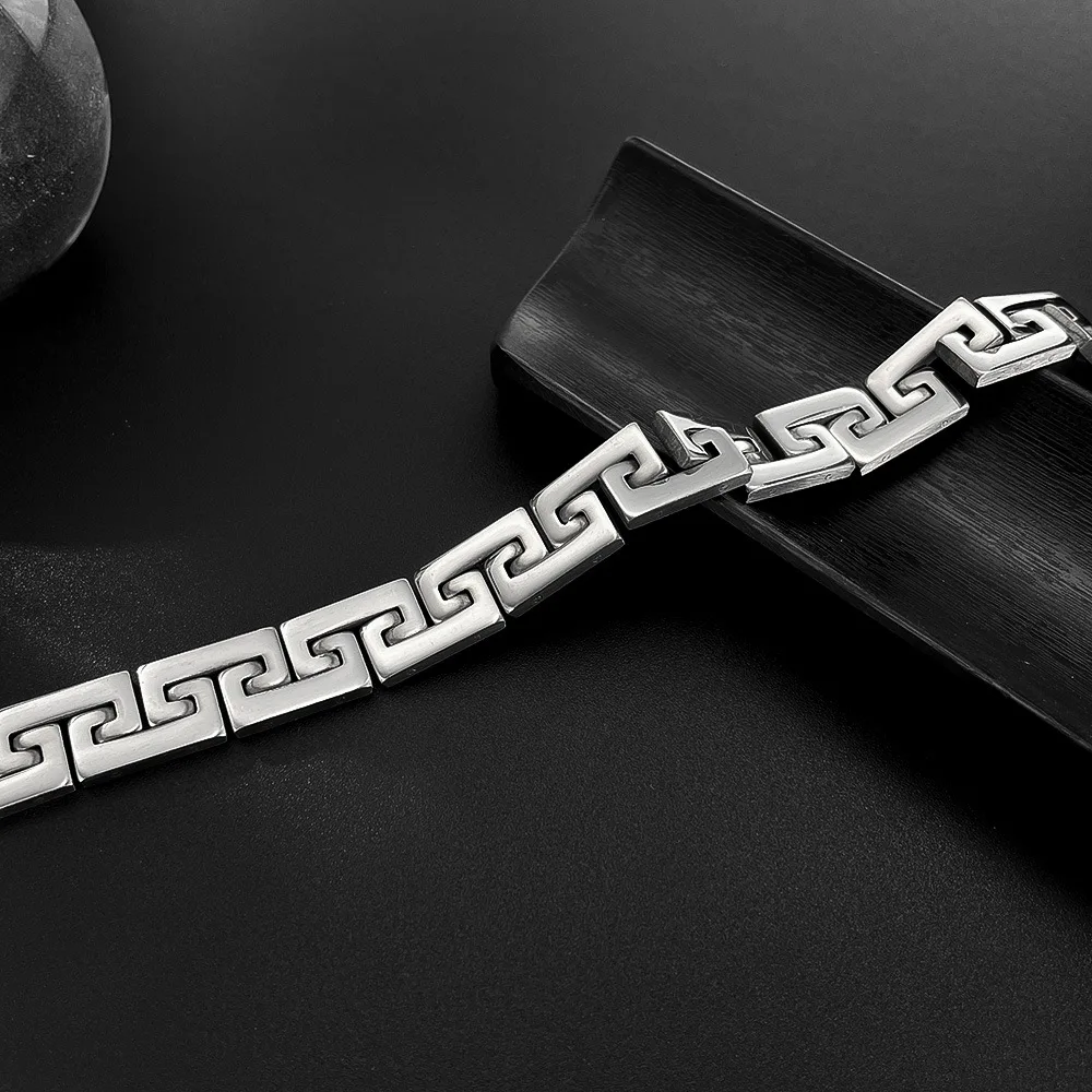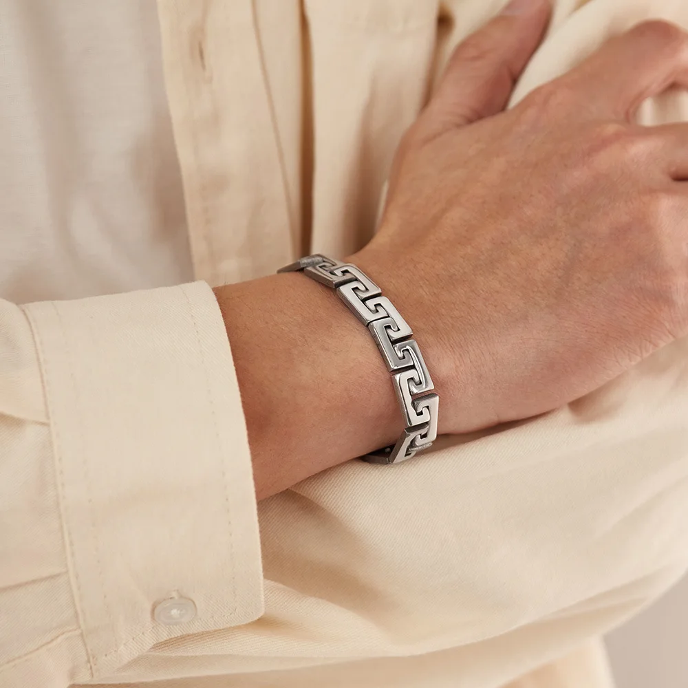 Dieses Charm Bracelet im geometrischen Design überzeugt durch klare Linien und eine kraftvolle Ausstrahlung. Die polierte Oberfläche verleiht dem Titanstahl-Look eine edle Note, während das robuste Material für Langlebigkeit und Widerstandsfähigkeit sorgt.